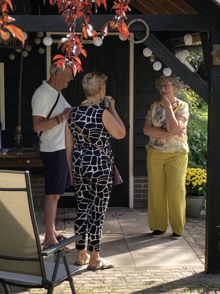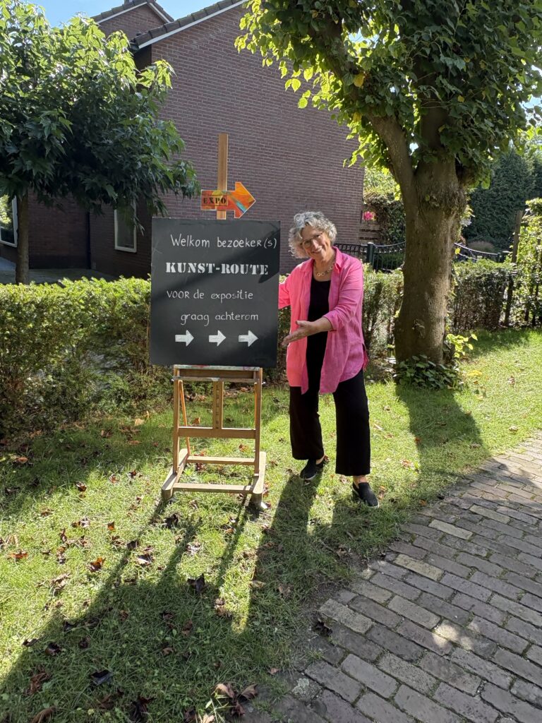 Het kunstroute-weekend thuis en in tuin en atelier was heel erg leuk. Ik mocht 75 bezoekers ontvangen die allemaal met veel aandacht mijn werk bekeken en met wie ik hele leuke (en soms intense) gesprekken voerde. Natuurlijk is Nesten & Geboortegrond een universeel thema – iedereen belandt immers bij zijn geboorte in een mensennest – en dus heeft iedereen zo zijn eigen ervaringen om uit te wisselen, maar dat deden velen oom! Daar ben ik best dankbaar voor. Mijn vroegere werk leverde reacties op als: boeiend, mooie kleuren, goede of minder goede composities etc. Dit werk gaat een tandje dieper… er vloeiden dit weekend zelfs tranen in mijn atelier, zo herkenbaar of door het werk zo geraakt worden. Mede hierdoor vloog het weekend voorbij! Toch maakt dit óók dat het tijd is voor wat lichters, werk waar ik blij en vrolijk van word en anderen dan meestal ook! Bloemen, bloemen, bloemen gonst in mij rond, in heldere kleuren op niet alledaagse ondergronden. Ik heb al wat geëxperimenteerd met schilderen op aardappelzakken, maar dat pakte toch te grof uit… afijn. De uitnodiging voor een volgende expositie , ditmaal in Ermelo, kwam dit weekend ook (gelukkig pas eind 2026) dus ik heb lekker de tijd voor nieuw werk! Nu eerst even uitrusten en mijn atelier herinrichten…
